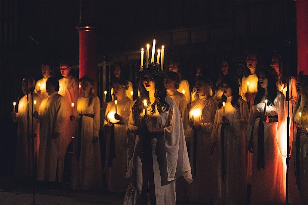 This special Sankta Lucia service is a Swedish celebration of the bravery and martyrdom of a young Sicilian girl, Lucia of Syracuse, who, according to legend, brought food to Christians hiding in Roman catacombs, lighting her way with a candlelit wreath on her head.