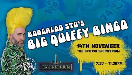 Join Boogaloo Stu for a fabulously chaotic night of Big Quiffy Bingo filled with camp cabaret energy and quirky prizes.